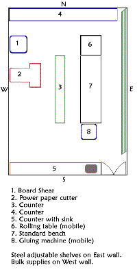 **Although the layout of a conservation operation depends on the amount and type of space available, there are some basic requirements to consider. It is useful to draw up a floor plan on graph paper and experiment with different layouts. This will ensure that adequate space is assigned for furniture, machines, services, and utilities, and that the best possible use is made of that space.