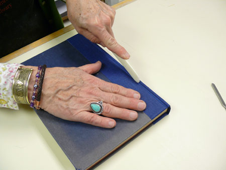 Use bone folder to work bookcloth into joints and to press bookcloth firmly to book sides.