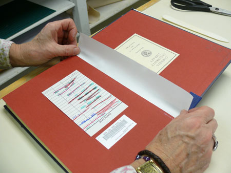 Place edge of paper strip about 7 mm from joint onto text block. Carefully lay strip over joint, press firmly with fingers. Then press strip firmly onto board. Use hands to remove air bubbles and wrinkles.